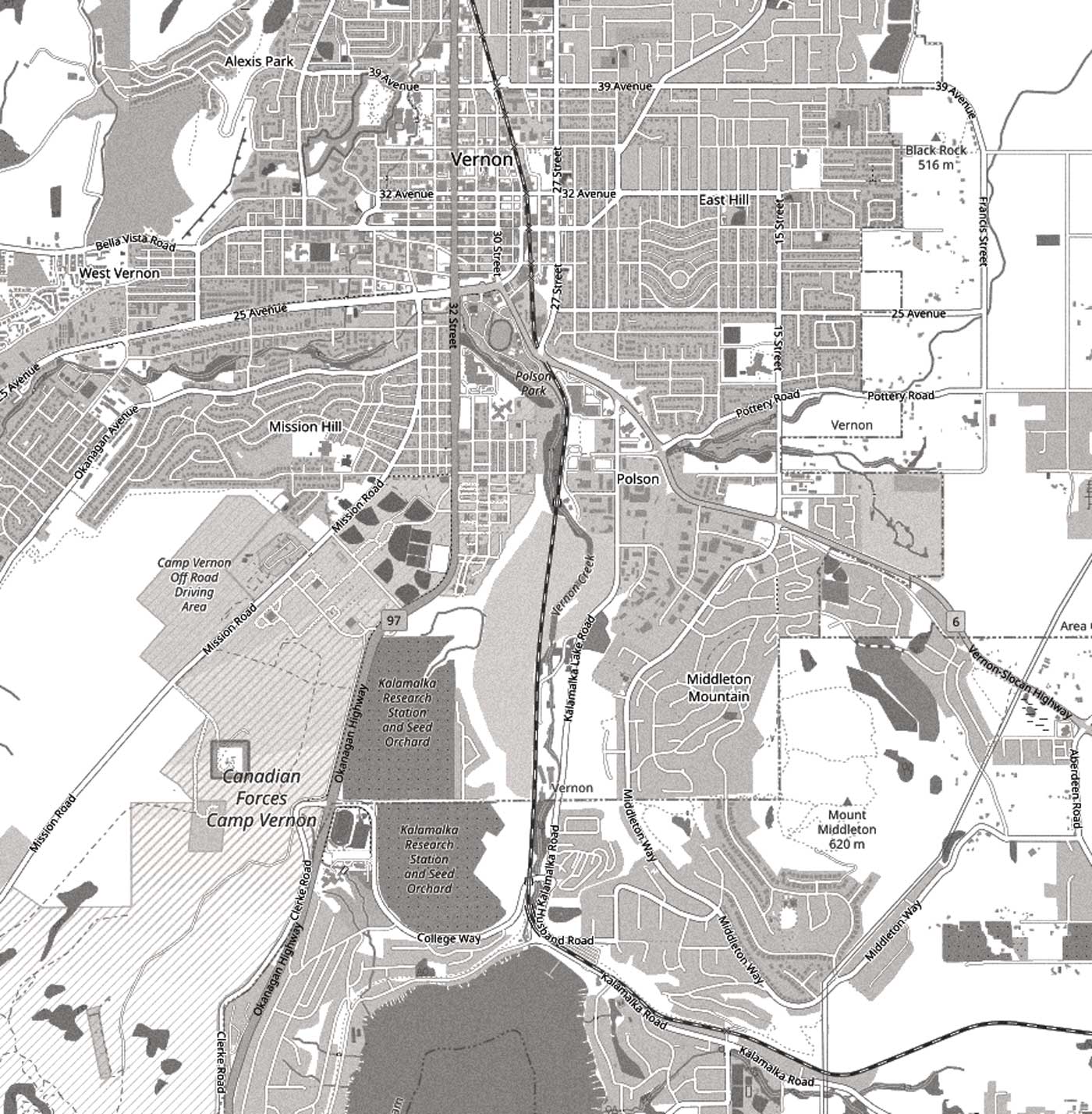 By designing with the natural terrain and urban context in mind, the community will be uniquely rooted in Vernon. The relationship between new building massing and the escarpment, the potential for views to the lake, the existing trail connections to downtown, and the potential for the integration of local and regional recreational links are all opportunities to be part of the larger whole.
